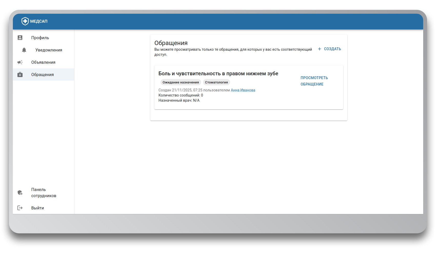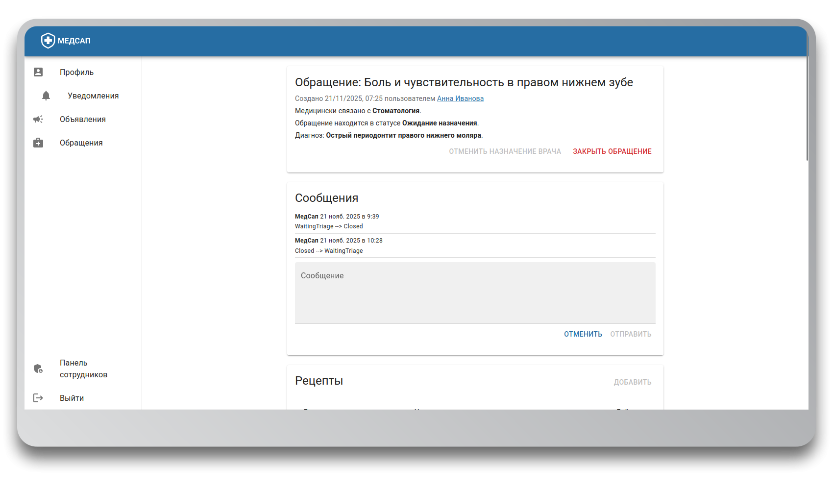 Открытие и закрытие обращений, добавление сообщений и истории визитов, прикрепление медицинских данных - каждое обращение фиксируется в системе и сохраняет полную хронологию событий для последующего анализа и контроля качества.