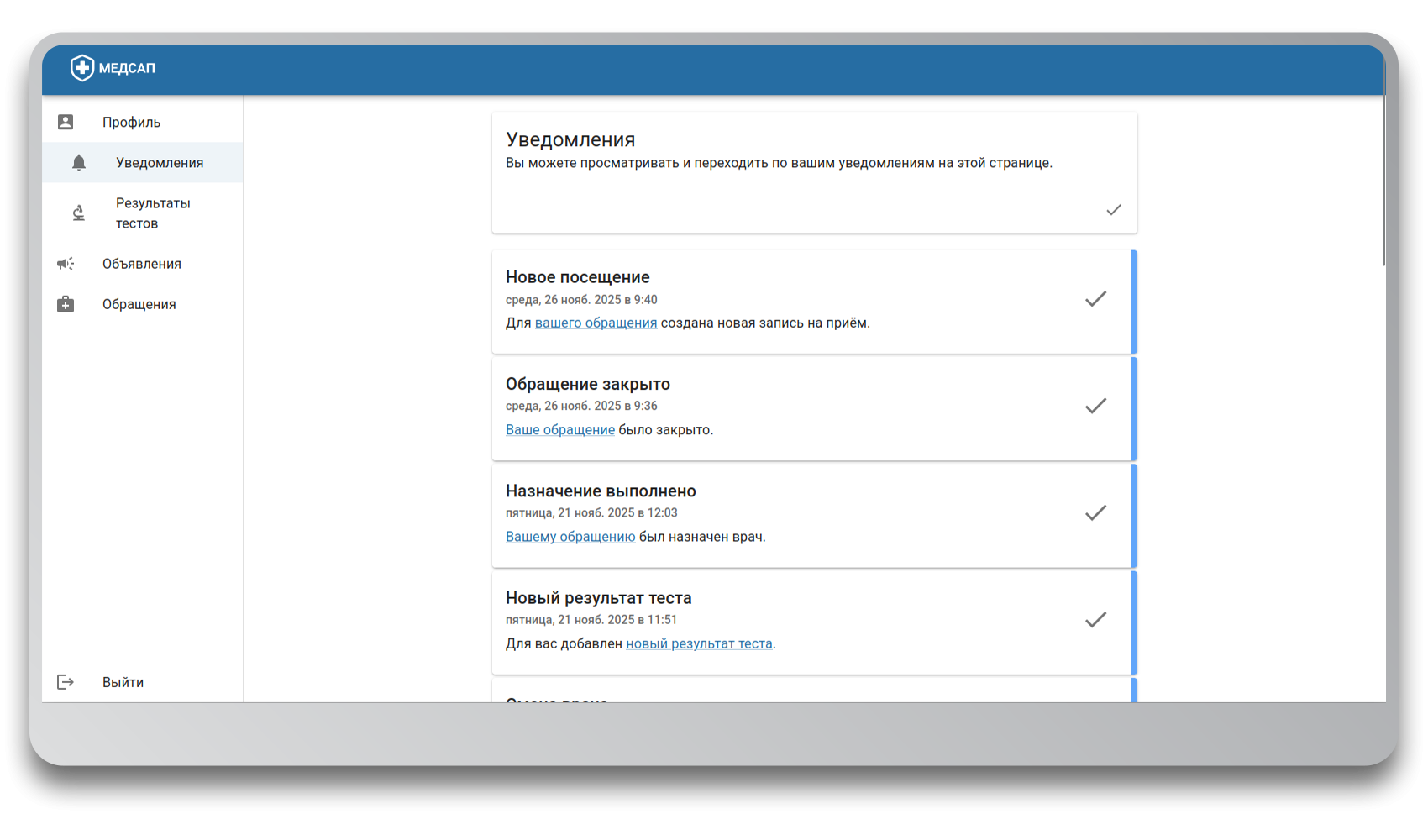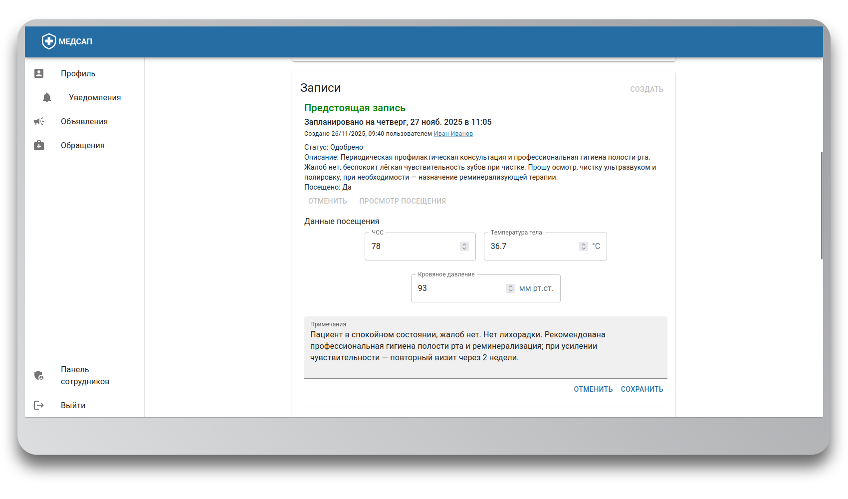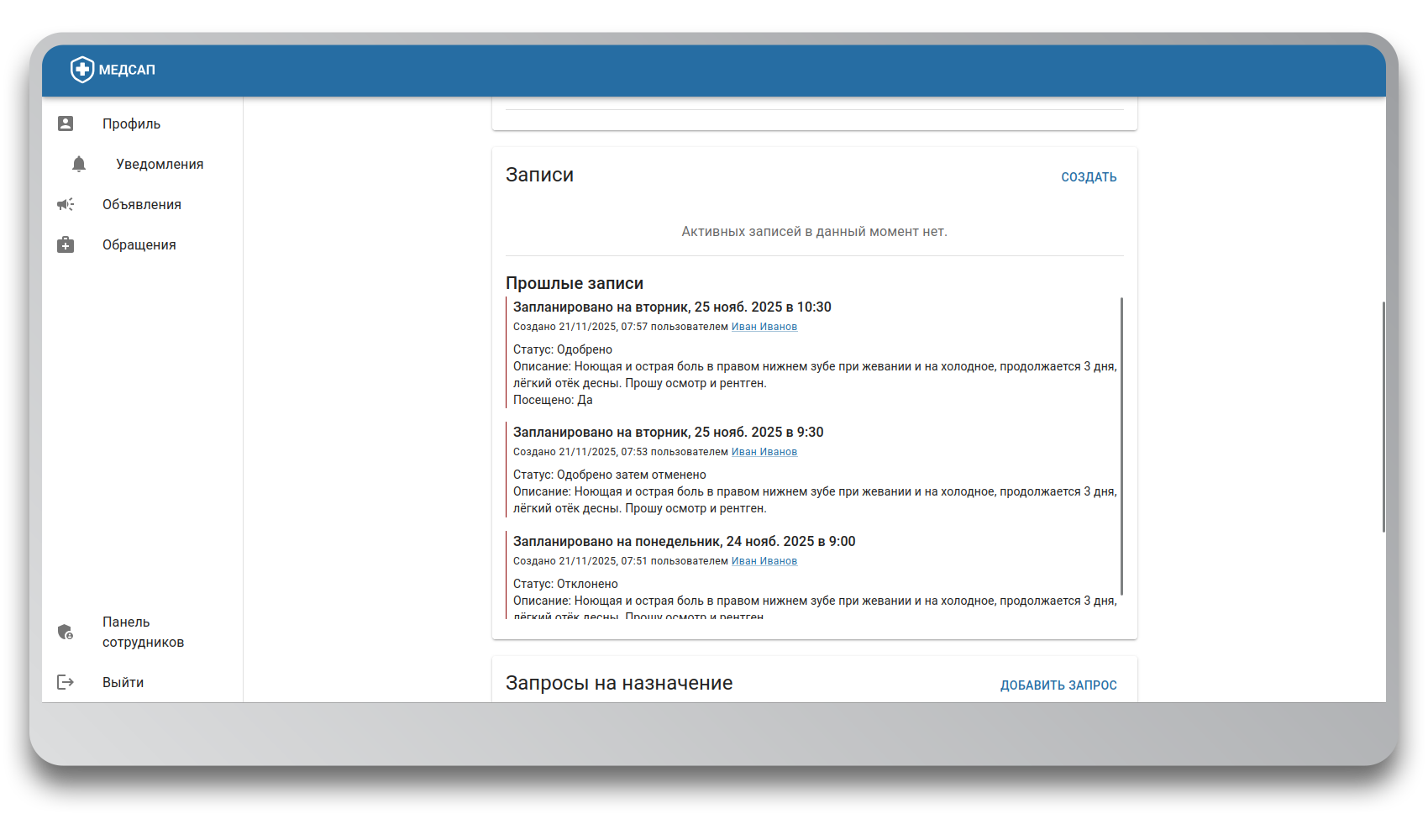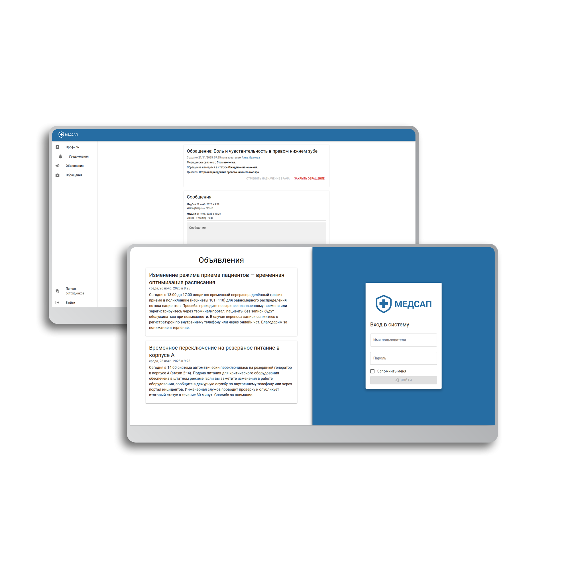 Медсап - инструмент для управления взаимодействием с пациентами и внутренними процессами клиники. Система формирует единое хранилище с контактами, историей обращений, результатами и документами, чтобы каждый сотрудник быстро получал нужную информацию и принимал решения оперативно.