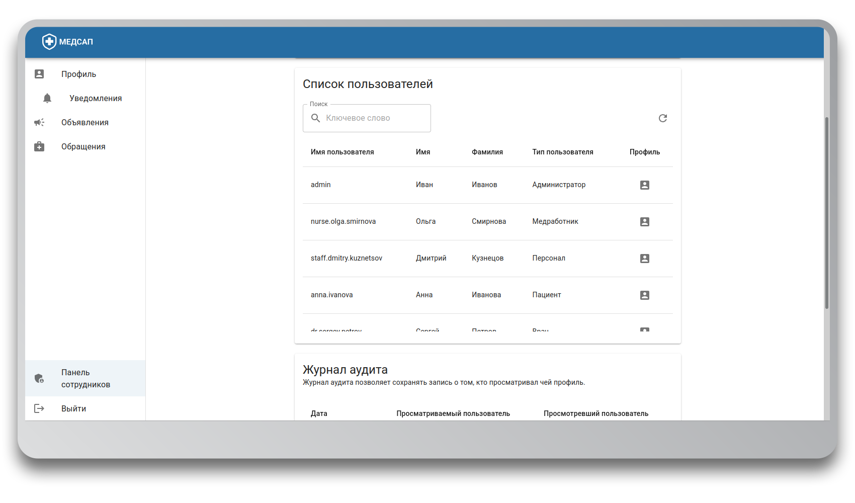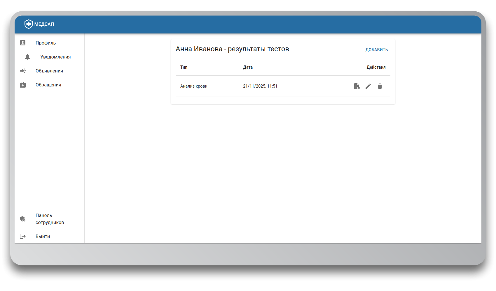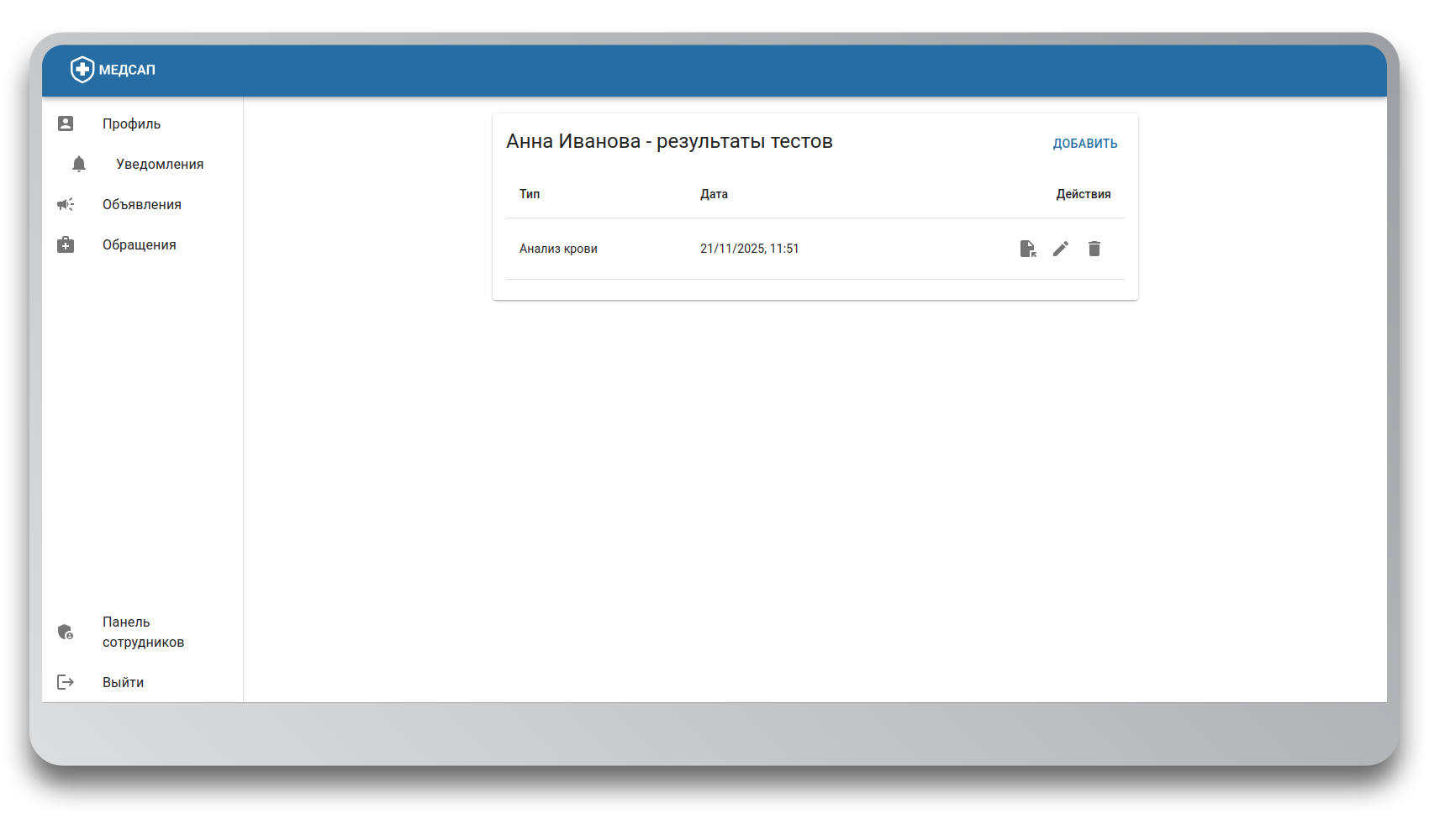 Загрузка и просмотр отчётов и результатов, онлайн‑доступ пациентов к результатам - медперсонал и пациенты получают оперативный доступ к данным и документам в рамках обращения.